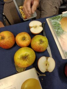En dan het steeltje (hoe lang, hoe dik, hoe diep zit het), het kroontje (hoe diep zit het, hoe groot is het, zijn de kroonblaadjes zwart of groen, zitten er wel of geen ribbeltjes op de kroonrand), het klokhuis, de kleur van het vruchtvlees, de smaak….. Op grote tafels lagen prachtige variëteiten appels en peren uitgestald met de naam erbij. We keken onze ogen uit, zóveel diversiteit!